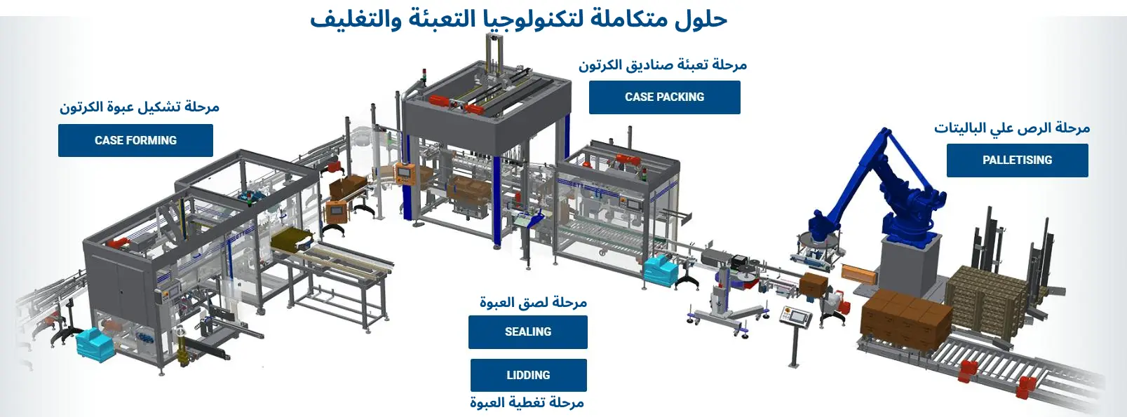 يمكن تقديم حلول متكاملة للمنتج بدءاً من التشكيل والتعبئة والغلق وحتى النقل على وحدات الباليتات (ترصيص المنتج على الباليتة)
